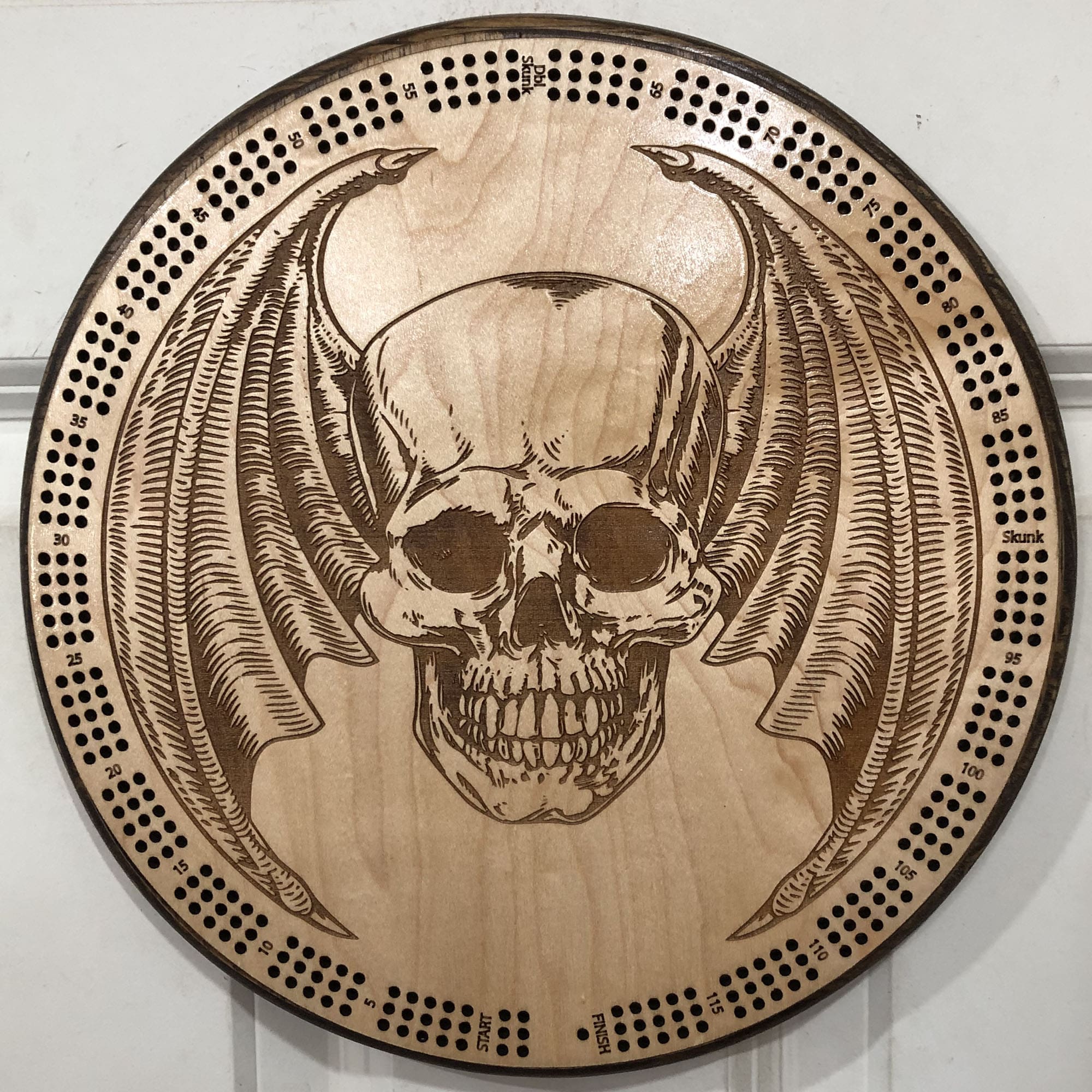This cribbage board features a menacing bat-winged skull design, merging themes of mortality and the supernatural. Skulls often symbolize the balance between life and death, while bats represent transformation and the unseen. This dark and striking design is perfect for fans of gothic and mysterious imagery.
