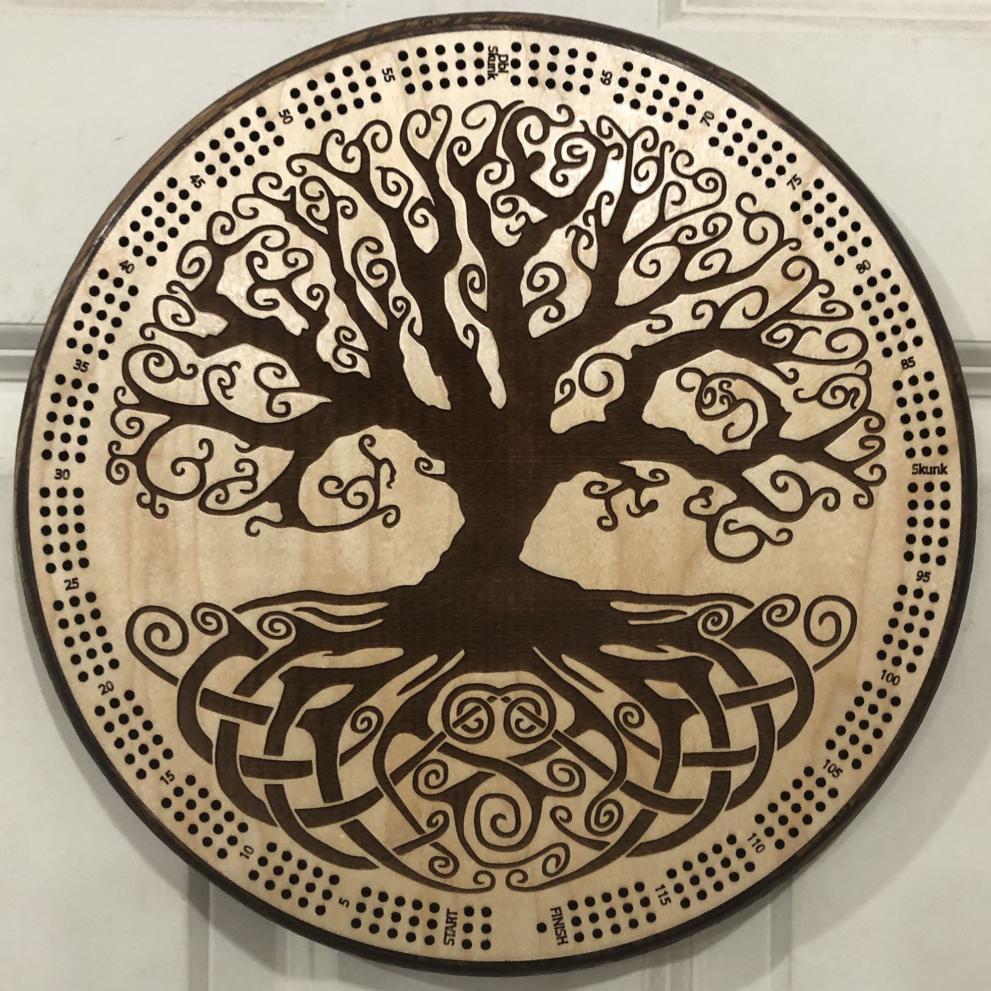 This cribbage board features a unique Tree of Life design with gothic-inspired swirling branches and roots, interwoven with Celtic knotwork. The design’s whimsical curls and twists bring a fantastical feel, with hidden heart motifs along the branches and roots, adding a layer of symbolic depth and charm. This design combines the traditional symbolism of the Tree of Life with a gothic and playful twist, setting it apart from other interpretations.