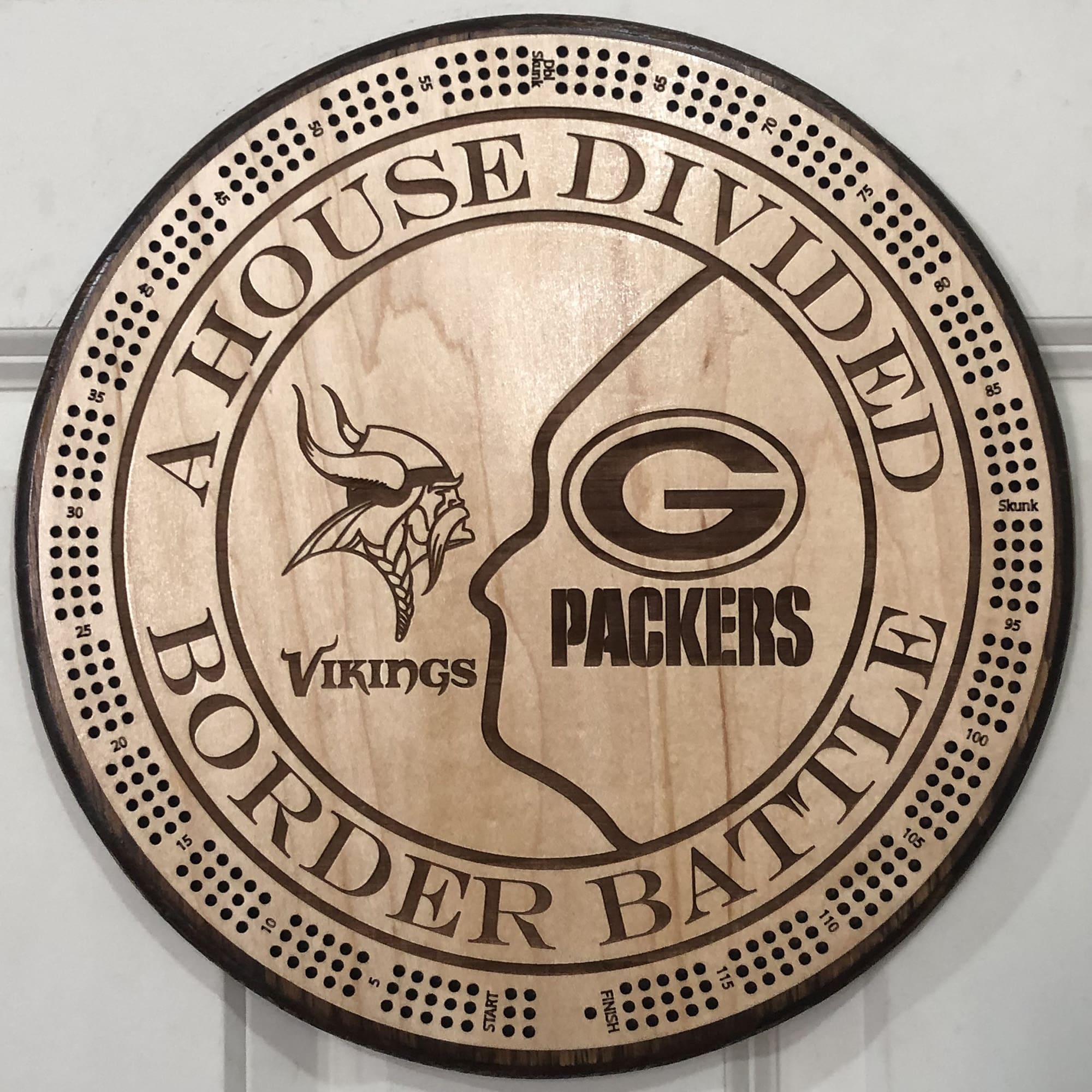 MN Vikings & Green Bay Packers logos each on their own sides of the Border between Minnesota & Wisconsin dividing the image. Enjoy healthy competition between MN & WI football fans. Our House divided series has been a huge hit with couples and siblings.
