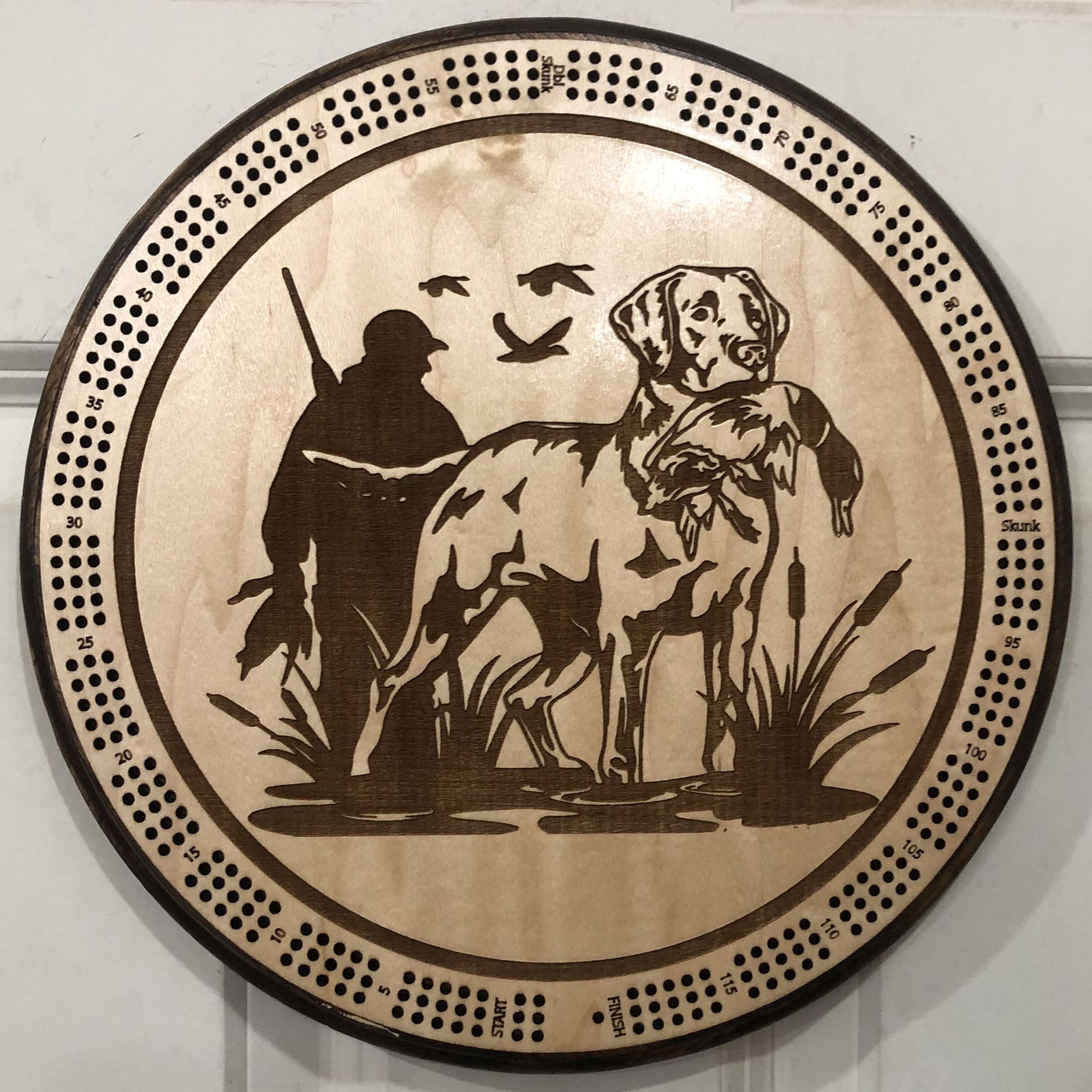 This cribbage board features a loyal retriever hunting dog, holding a freshly caught bird, with a hunter standing in the background and ducks flying overhead. The detailed scene captures the essence of the hunt, making it the perfect piece for duck hunters, sporting dog lovers and outdoor enthusiasts.