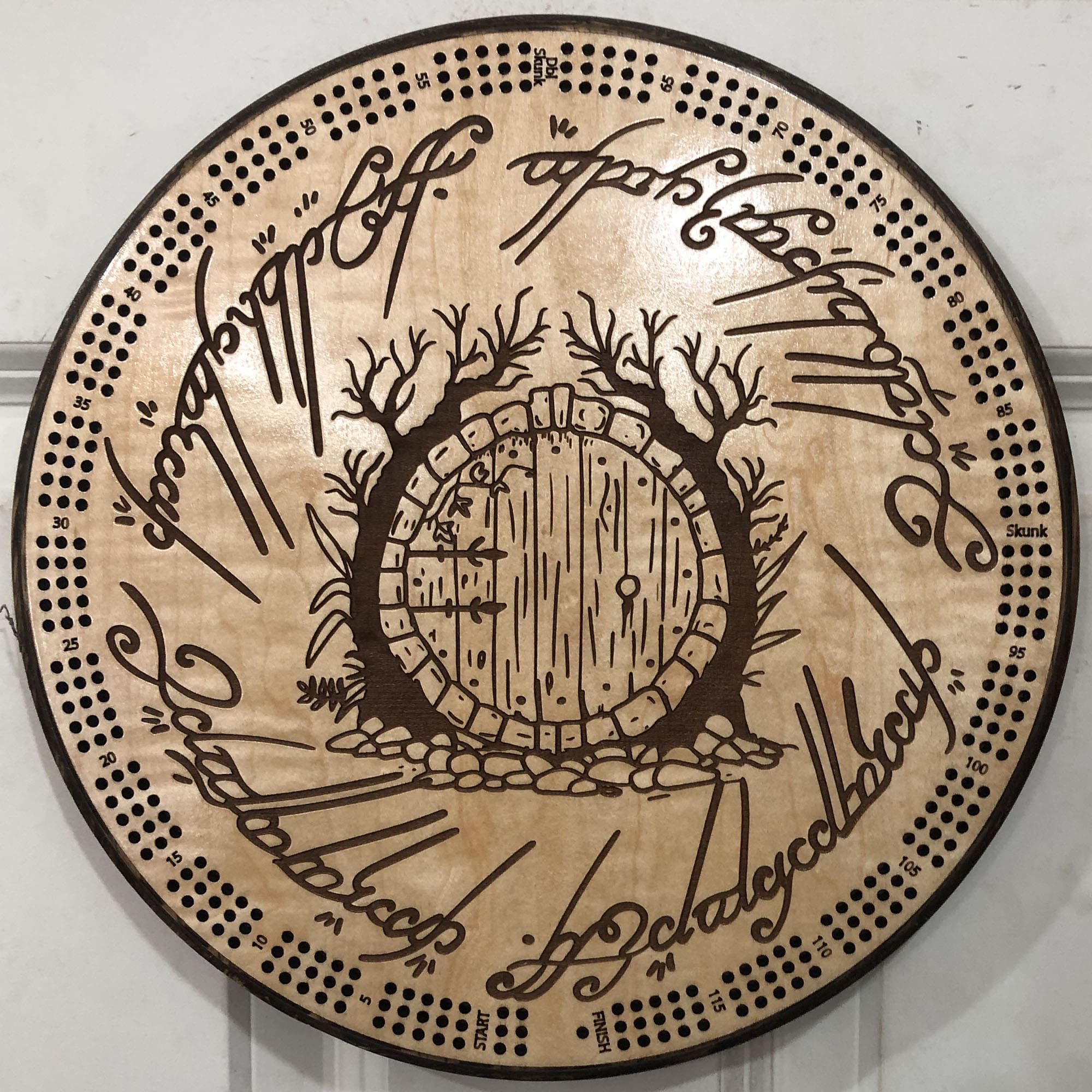 This wall-mountable cribbage board features: