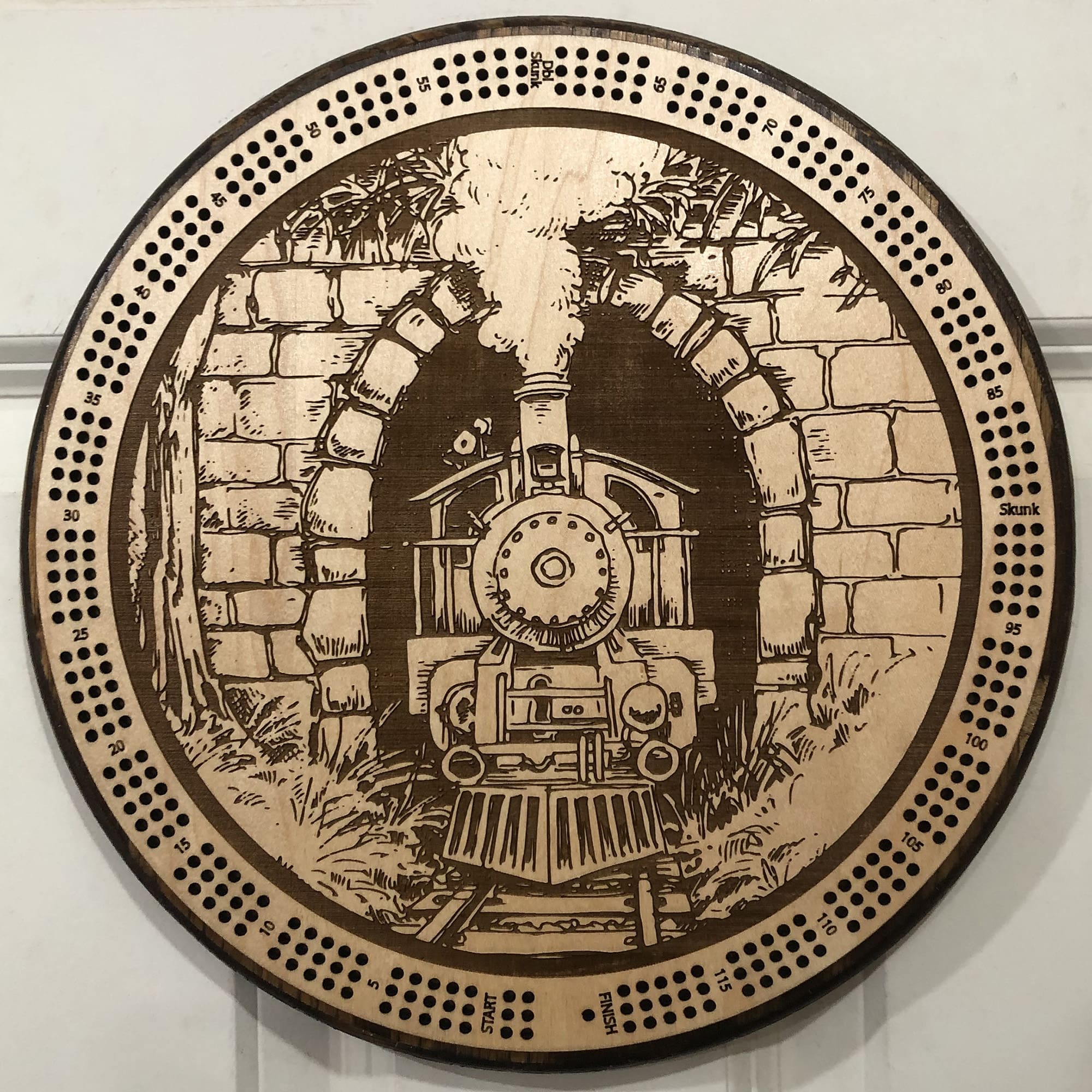 Train Tunnel Cribbage Board | 3-Track, 120-Point Round Game with Pegs & Cards