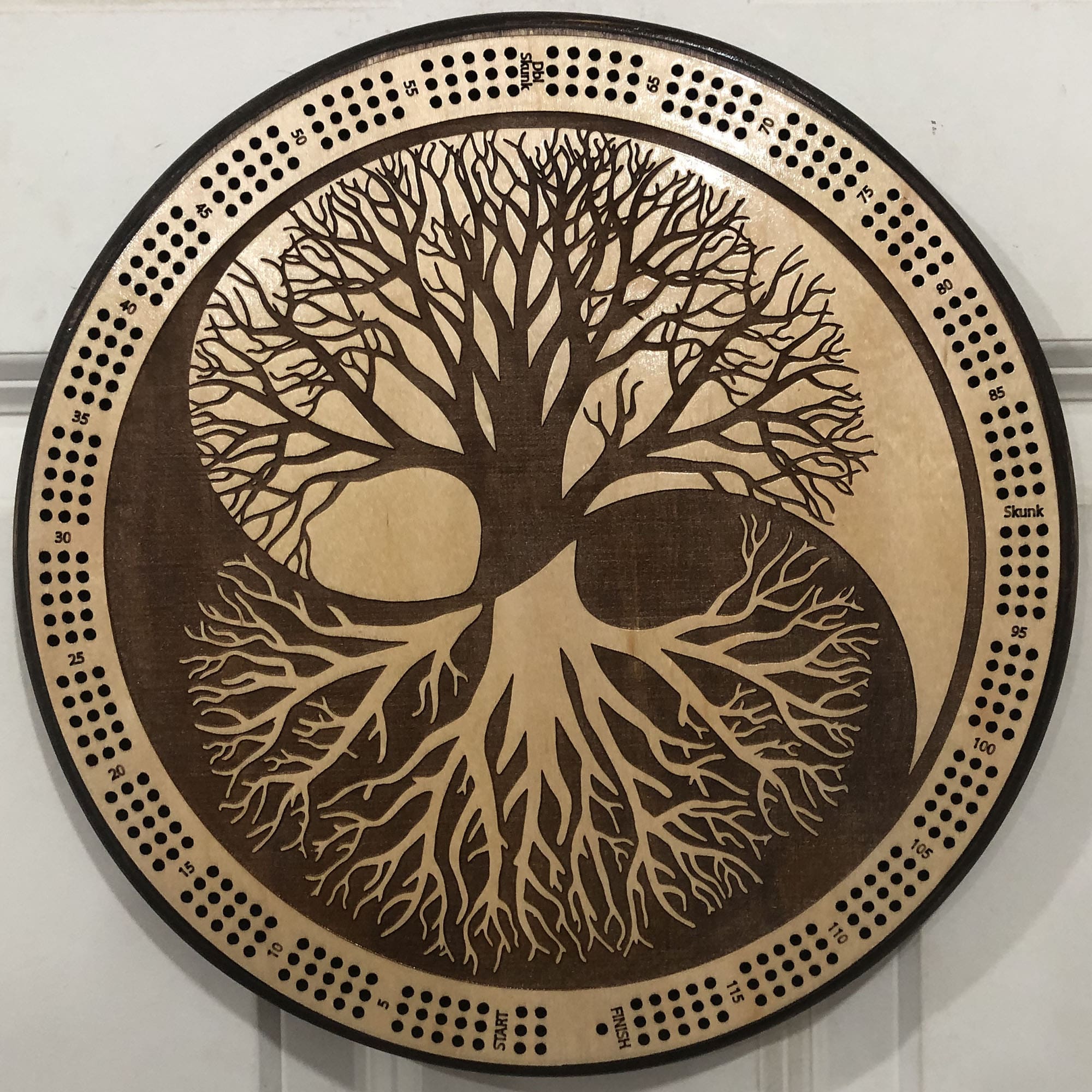 This cribbage board features a striking yin-yang design with a beautifully etched Tree of Life, symbolizing balance and connection between roots and branches. The intricate detail of the tree’s roots and branches makes this a captivating and meaningful piece for both play and display.
